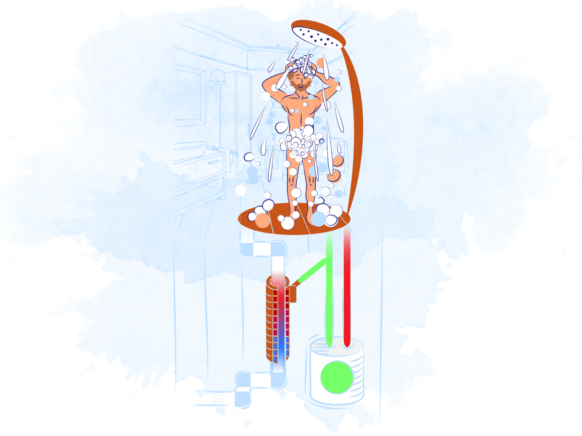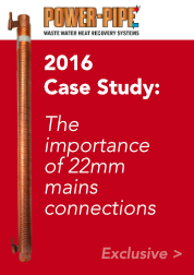 A Power-Pipe® recovers the heat energy lost down the drain during showering and uses it to pre-heat incoming mains freshwater. Saving £ + energy.